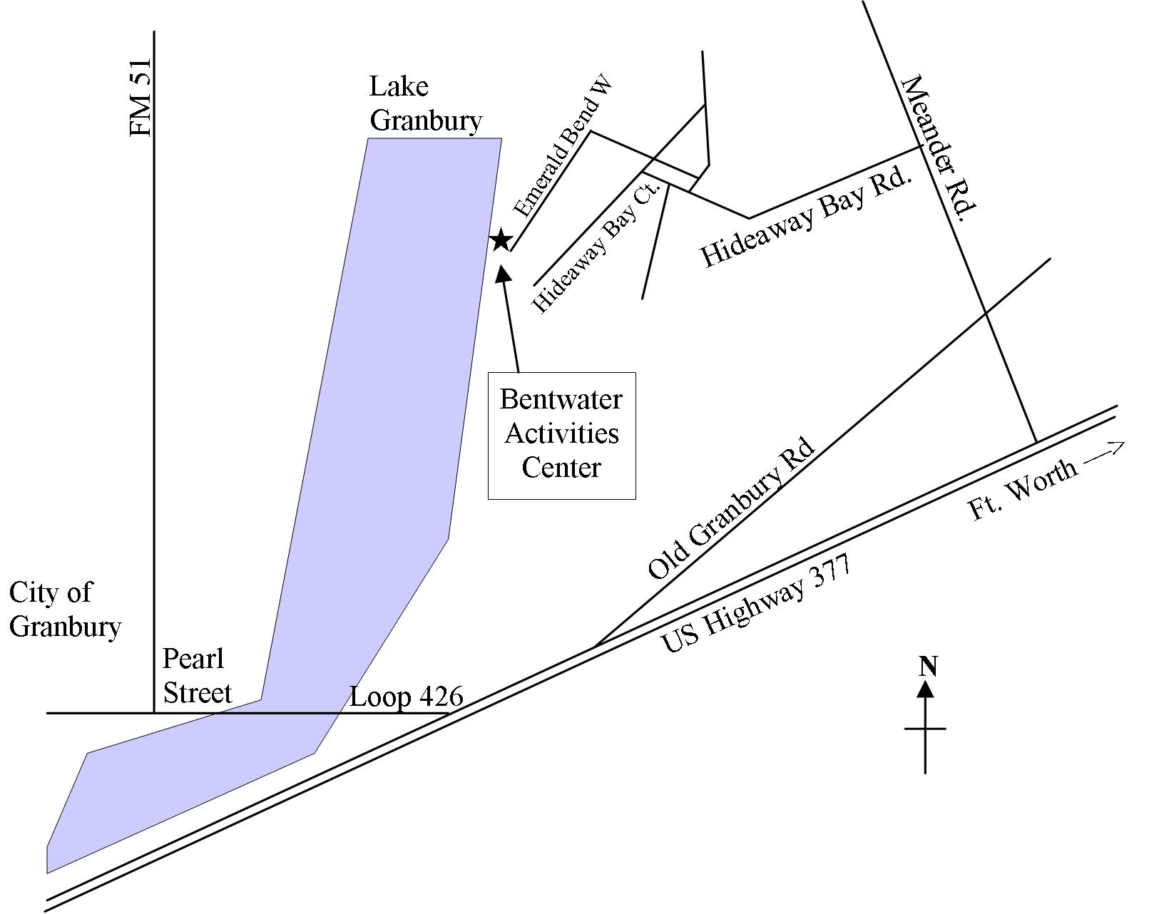 Directions from Granbury are: 1. Go East on 377 from Granbury and turn left on Old Granbury Road located 1/2 mile past the intersection of the Acton Highway and 377 past the Chevy dealership. 2. Go about 1 1/2 mile to a 3 way stop and turn left onto Meander Road. 3. Go about 3/4 mile and turn left onto Hideaway Bay Road. 4. Go about 3/4 miles and turn right into Bentwater Development at a stone waterfall. 5. Go 600 feet and turn left onto Emerald Bend West. 6. Go 3/4 mile the end of the street. The entrance to the marina and Activity Center is on the right.